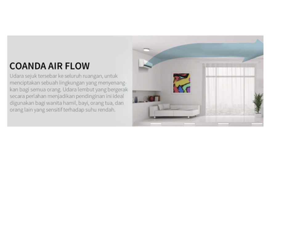 Coanda Airflow: Teknologi ini mengarahkan aliran udara secara diagonal ke atas, menghindari langsung mengenai penghuni ruangan, sehingga menciptakan pendinginan yang lebih efektif dan kenyamanan yang lebih baik.