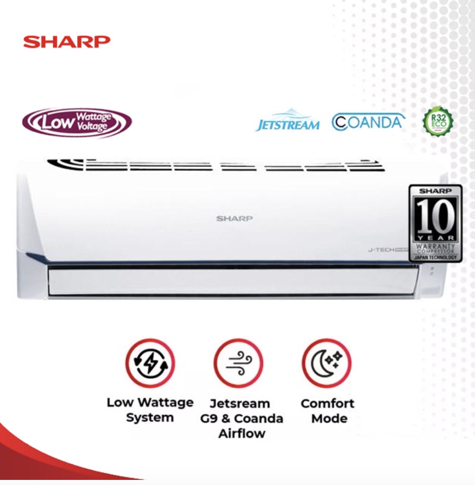 Fitur AC Sharp AH A5UDL adalah dilengkapi dengan fitur Teknologi JetStream G9, Fitur Coanda Airflow, Mode Comfort, Pengaturan Suhu 14 Celcius, Freon R32 Eco, Operasi Low Wattage dan Low Voltage.